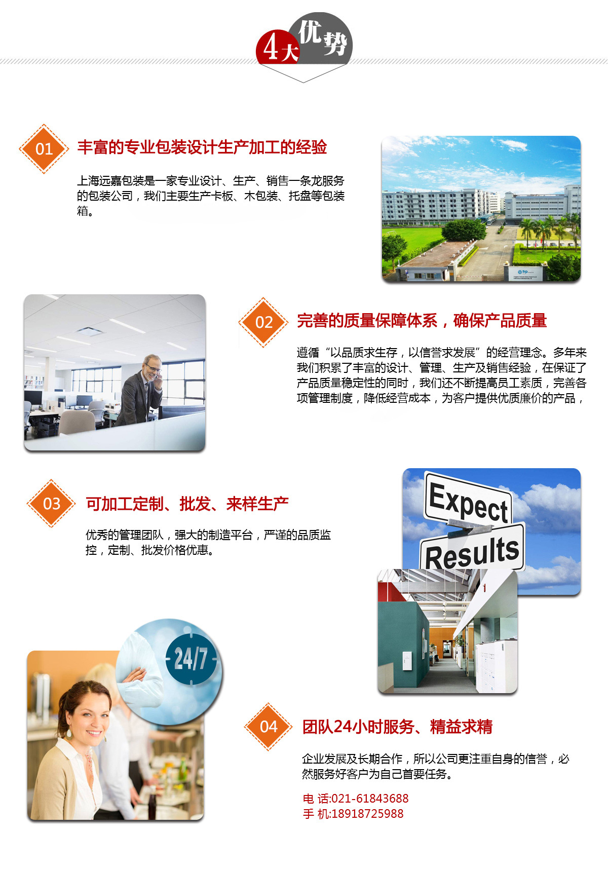 上海遠嘉包裝技術(shù)有限公司擁有數(shù)年包裝設(shè)計生產(chǎn)經(jīng)驗。為客戶設(shè)計定制各類出口包裝箱,木箱包裝,免熏蒸包裝箱,鋼帶箱,扣件包裝箱,花格箱,大型設(shè)備包裝箱,實木熏蒸包裝箱,木托盤,熏蒸及免熏蒸托盤,熱縮膜包裝等。